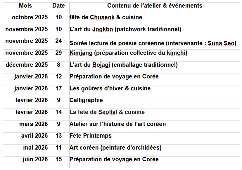 Laissez-vous transporter par la richesse et la diversité de la Corée à travers une programmation culturelle pensée pour vous. Nos activités sont une invitation à un voyage authentique, une préparation idéale pour votre future escapade coréenne.